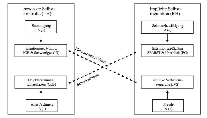 Abb. 19: Das PSI-Modell psychischen Funktionierens [nach Kuhl 2009; A+/− bedeutet, dass der Affekt aktiviert, A(+), A(−), dass er herabreguliert wird]
